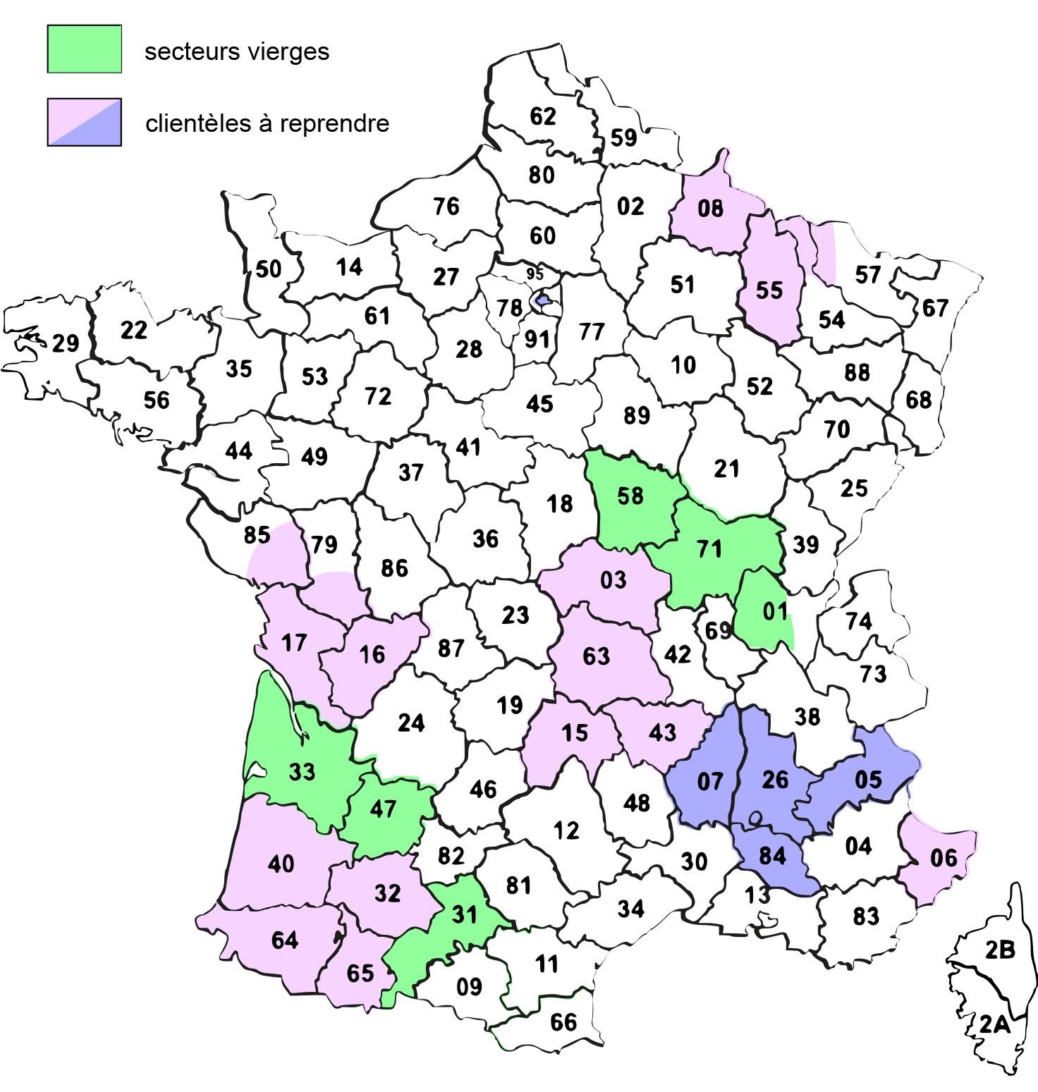 Clientèle à reprendre au plus tôt. Transition avec l’animateur parti à la retraite. - - Gers, Landes, Pyrénées-Atlantiques, Hautes-Pyrénées. Les Départements 32 (Auch, …), 40 (Dax, …), 64 (Pau, Bayonne, …) et 65 (Tarbes, Lourdes, …).